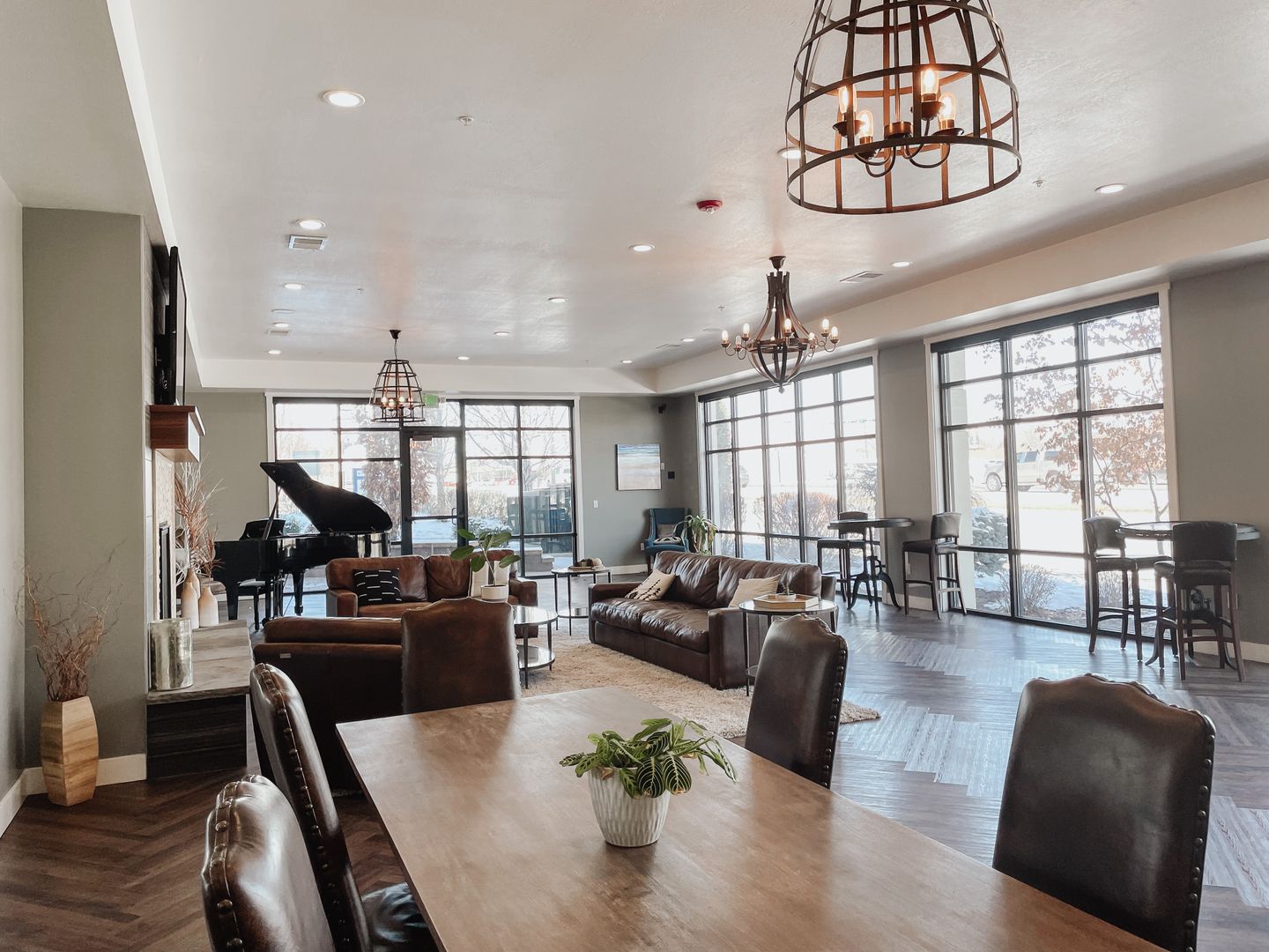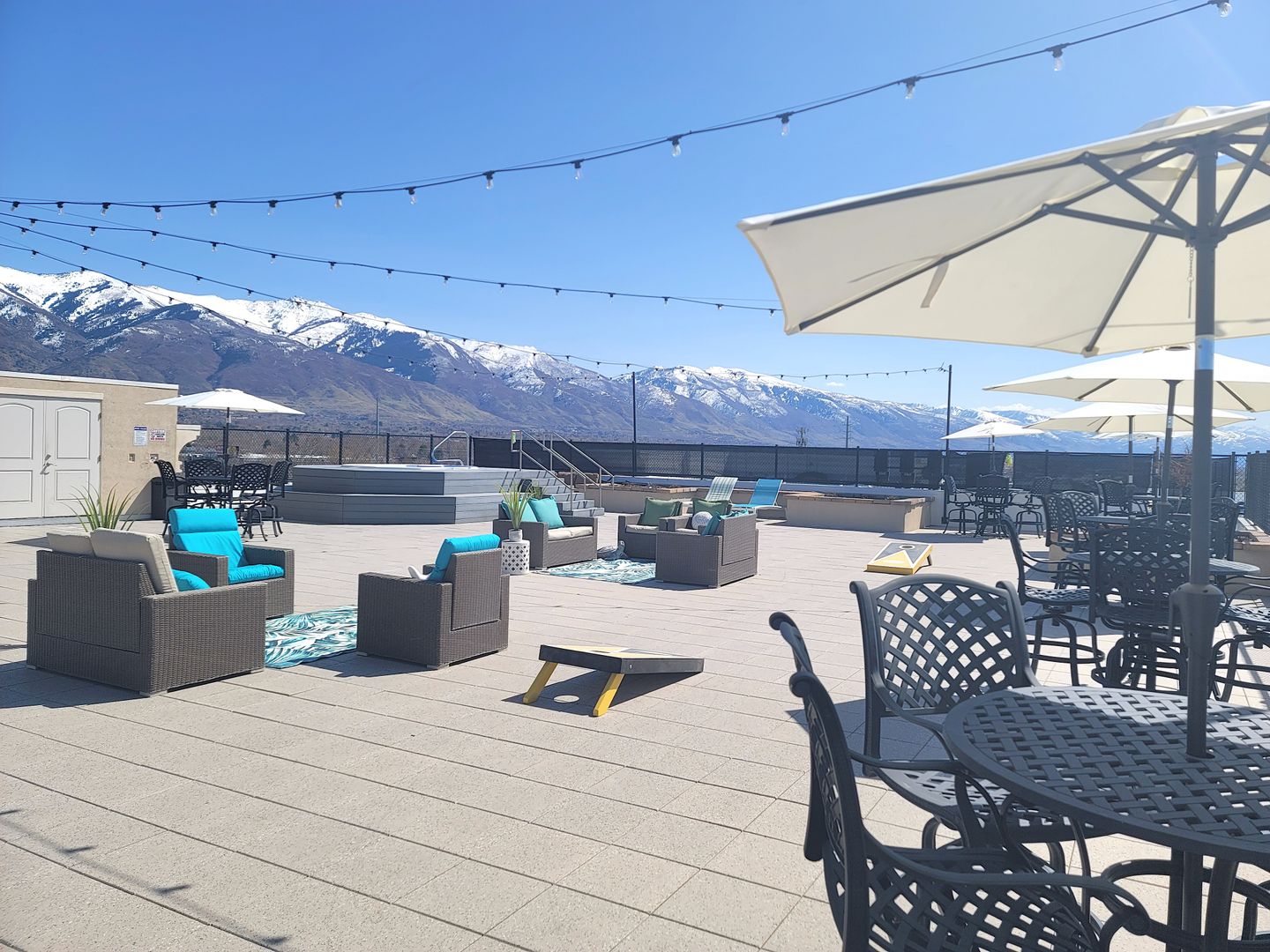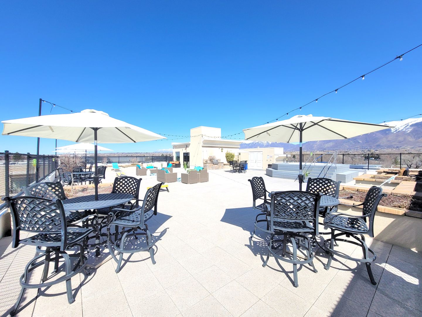 Our beautiful courtyard features a large pool and in-ground spa (open year-round), a fire pit, and built-in BBQ grills for the best entertaining. Our rooftop deck offers stunning views of the mountains, the Great Salt Lake, and Antelope Island. Several comfortable areas to gather, a built-in BBQ grill, and a hot tub will complete your city-style rooftop experience.