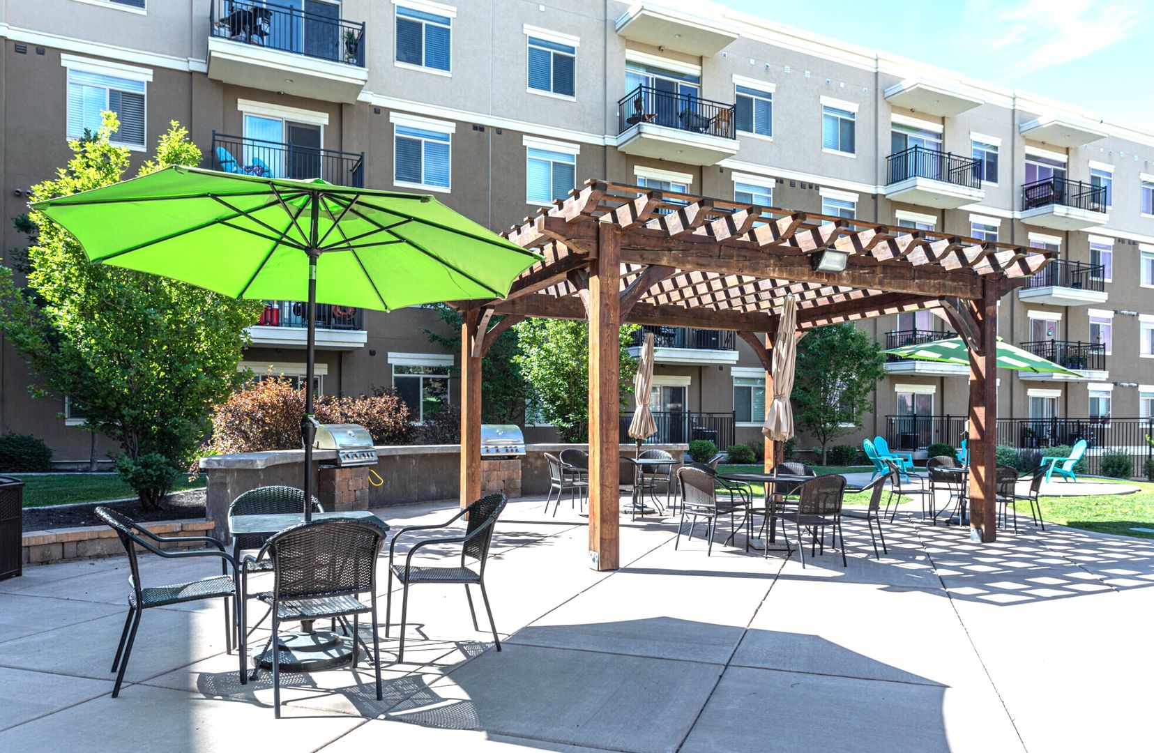 Our beautiful courtyard features a large pool and in-ground spa (open year-round), fire pit, and built-in BBQ grills for the best entertaining.