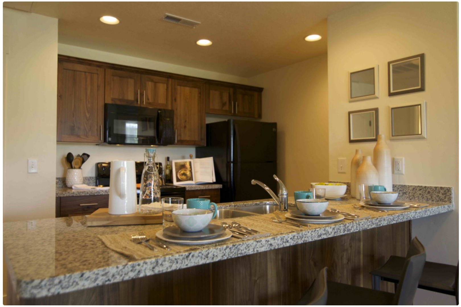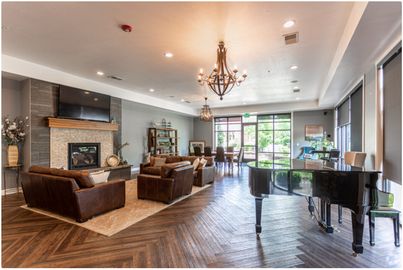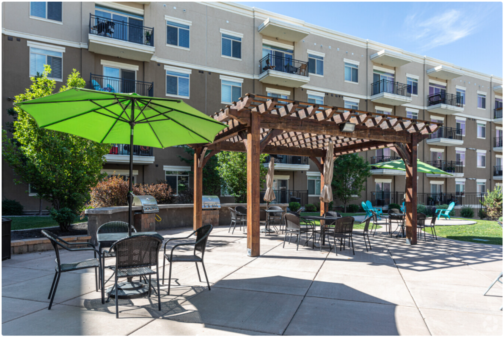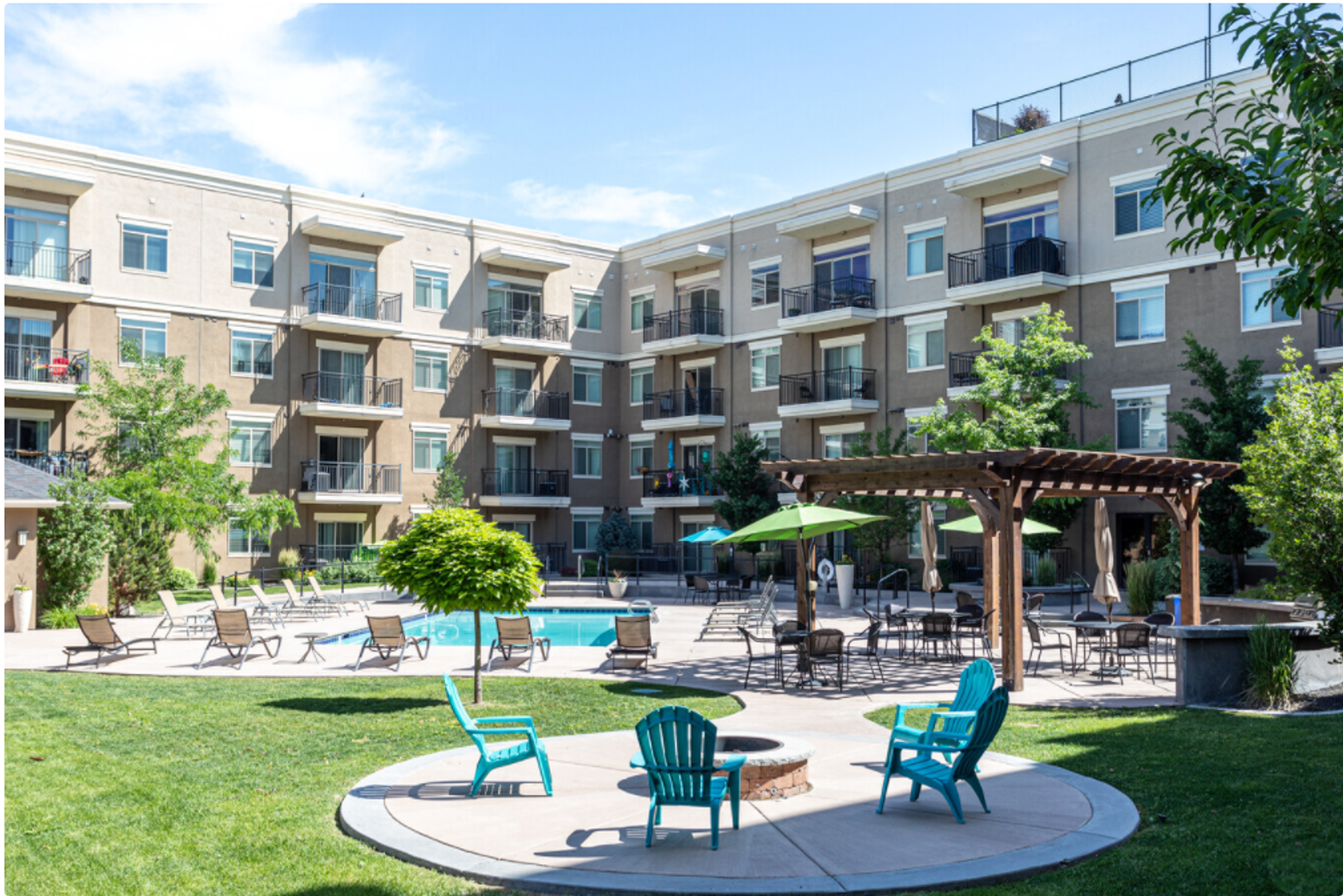 Our beautiful courtyard features a large pool and in-ground spa (open year-round), a fire pit, and built-in BBQ grills for the best entertaining.